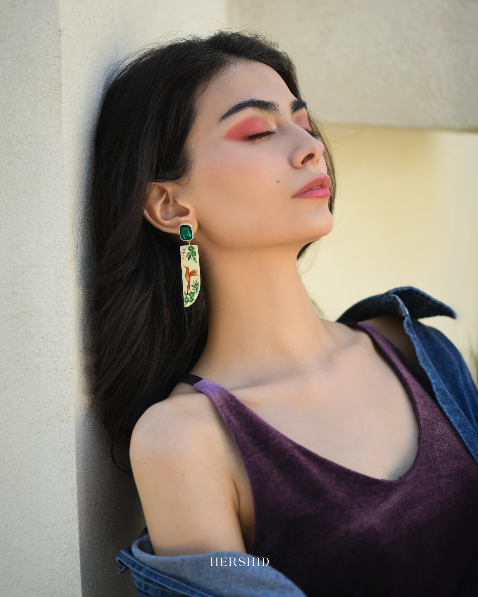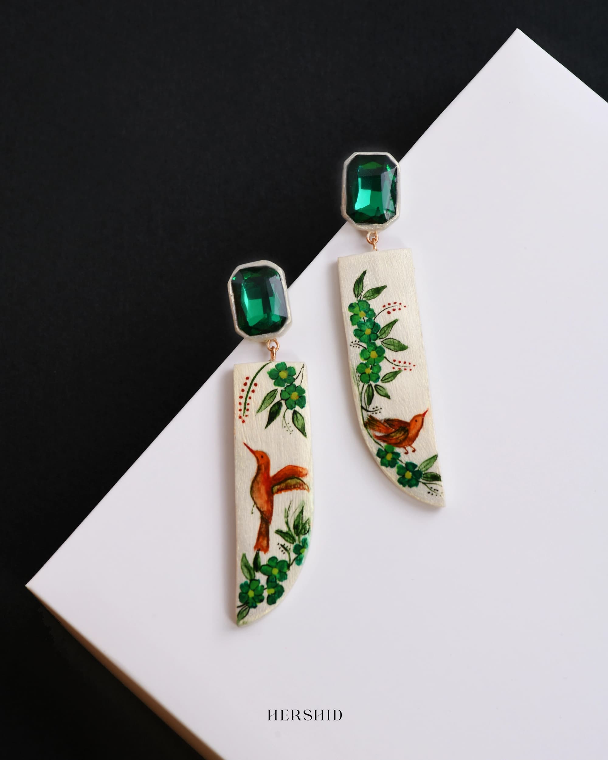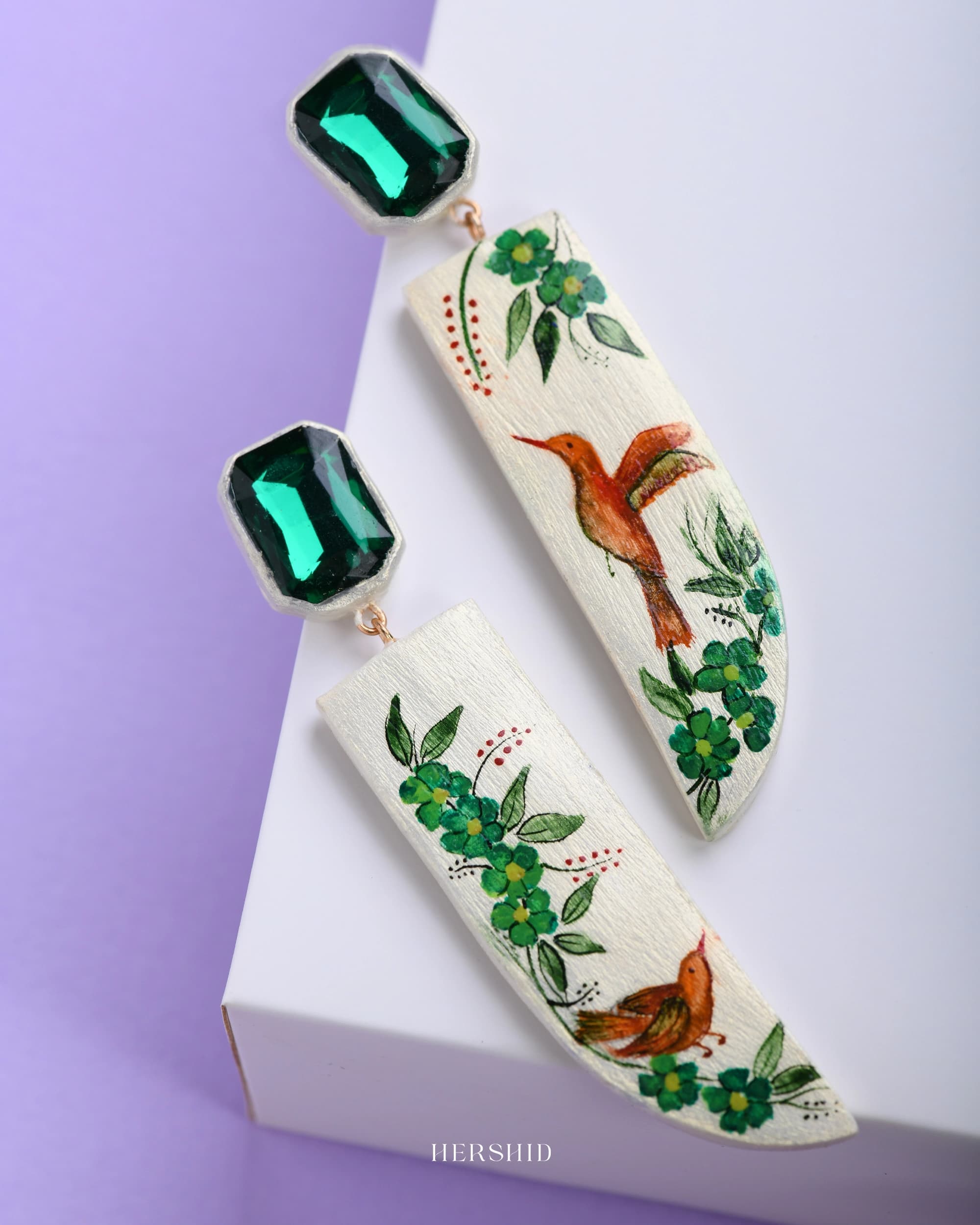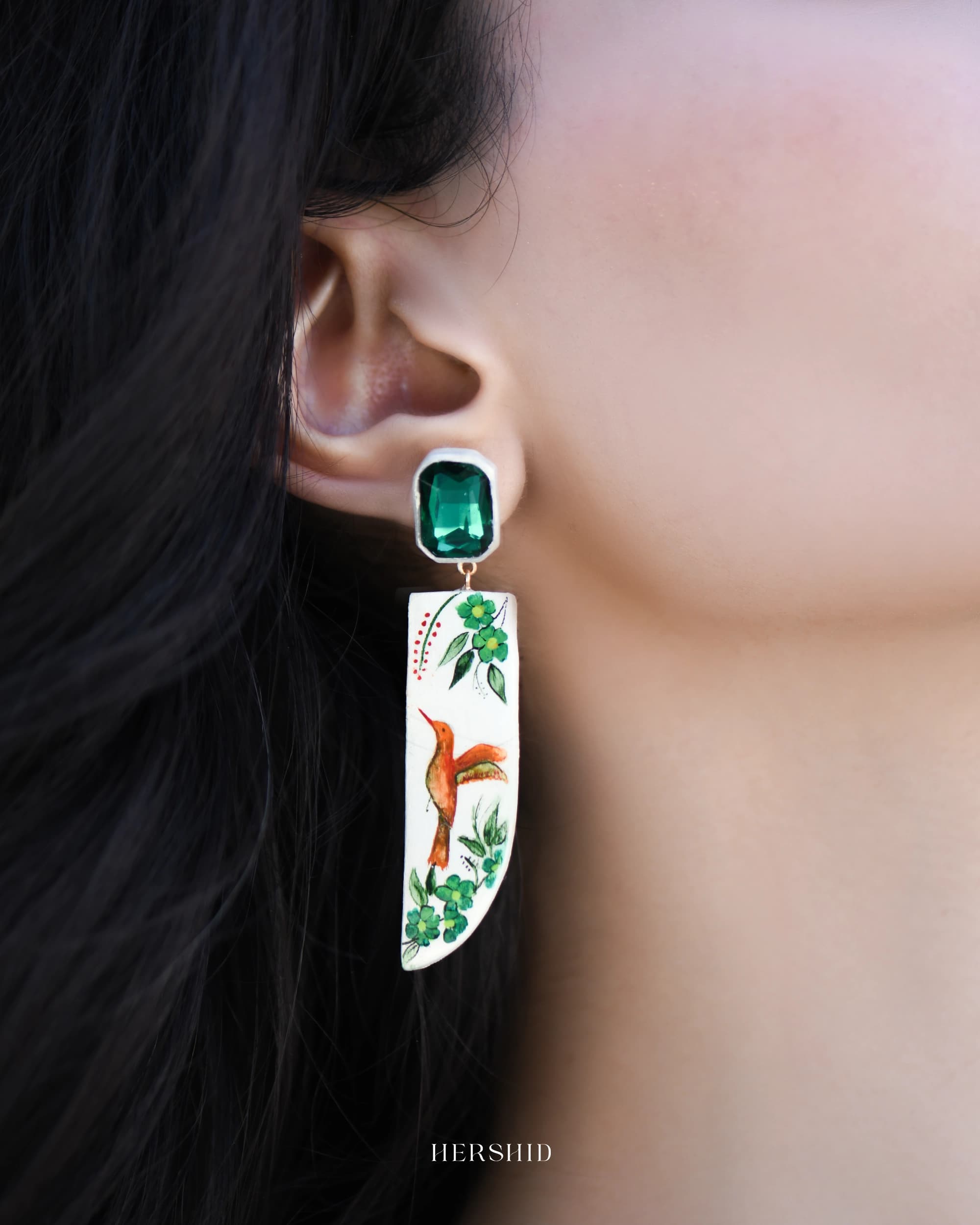 Aurora Earrings handcrafted with intricate hand-painted designs, these earrings showcase vibrant hummingbirds amidst lush greenery, symbolizing nature’s grace and beauty. Accented with an emerald-green crystal, these earrings are the perfect statement piece for any occasion.